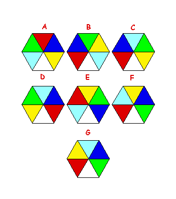 Un jeu : Reconstituer la figure ci-dessous en associant les 7 hexagones. Deux côtés communs doivent avoir la même couleur. Solution